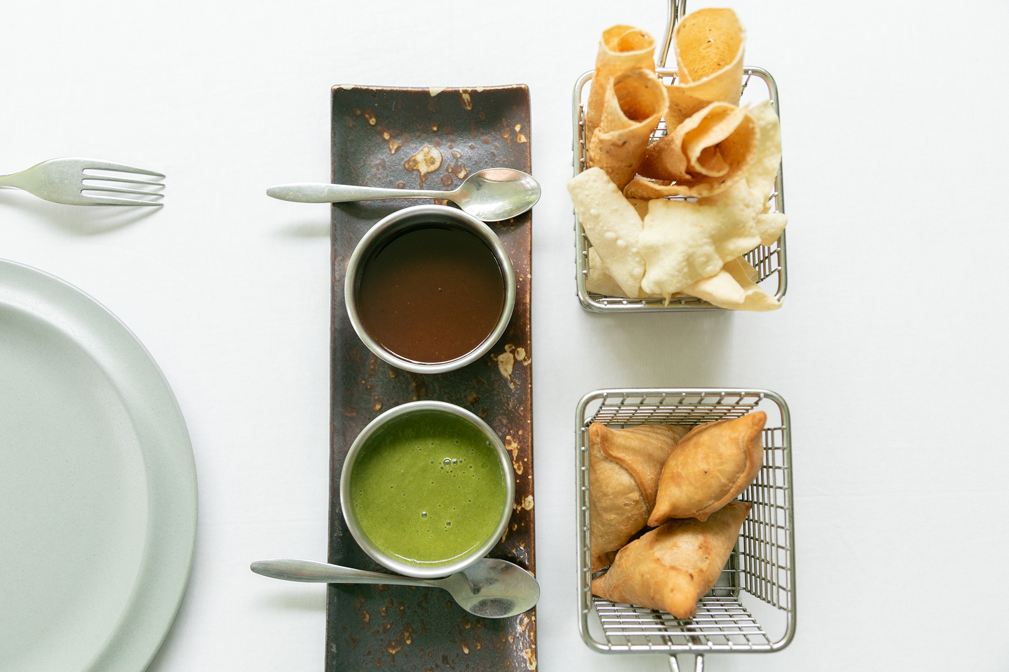 เรามาเริ่มกับอาหารจานแรกกันแล้วกันครับ นั่นก็คือ “ซาโมซ่าผัก” ถ้าเทียบกับอาหารฝรั่งก็คือ Starter ผมคิดว่าจานนี้คนไทยหลายคนอาจคุ้นเคยดี ผมว่ามันคล้ายกับกะหรี่ปั๊บของไทย แต่สำหรับซาโมซ่านั้น จะห่อแบบสามเหลี่ยม ไส้ข้างในมีส่วนประกอบหลักๆ เลยคือ มันฝรั่ง แครอท ผักกะหล่ำหั่นฝอย คลุกเคล้าด้วยเครื่องเทศ เมื่อห่อเสร็จแล้วนำเอาไปทอดพอเหลืองกรอบ สะเด็ดน้ำมันพร้อมทานกับน้ำจิ้มสะระแหน่ ความกรอบของแป้งกับความมันของมันฝรั่งพร้อมกับรสชาติอันสดชื่นของน้ำจิ้มสะระแหน่นั้น เรียกได้ว่าเป็น perfect combination ที่ช่วยเรียกน้ำย่อยได้ดีทีเดียว