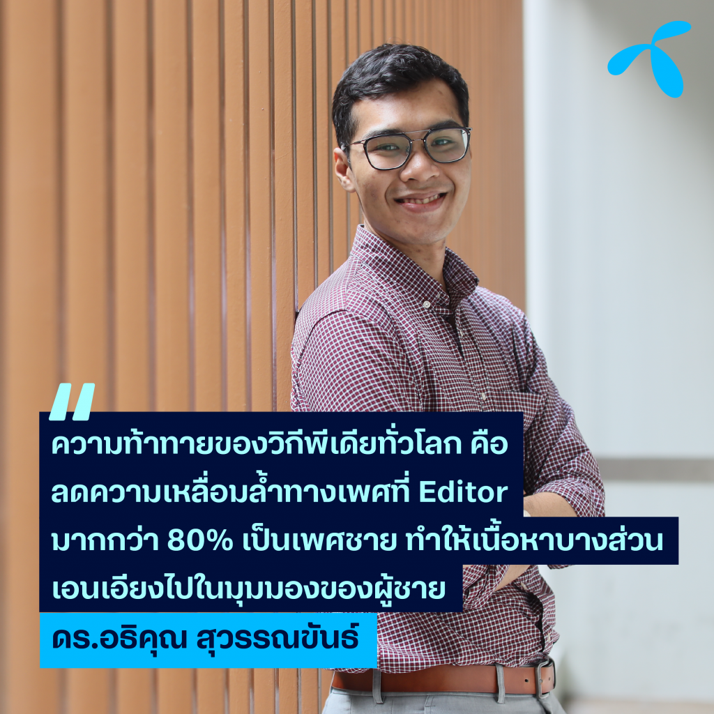 ดร.อธิคุณ สุวรรณขันธ์ ประธานวิกิมีเดียประเทศไทย เล่าถึงแนวคิดการจัดงานในวันสตรีสากล (International Women’s Day หรือ IWD) ซึ่งตรงกับ 8 มีนาคมว่า ความท้าทายหนึ่งของวิกีพีเดียทั่วโลก คือความเหลื่อมล้ำทางเพศที่ผู้แก้ไขบทความ (editor) หรือปรับปรุงเนื้อหานั้นมากกว่า 80% เป็นเพศชาย ทำให้เนื้อหาบางส่วนเอนเอียงไปในมุมมองของผู้ชาย อาทิ เนื้อหาของการใช้คำในประเทศสเปนหรืออิตาลี จะเรียกผู้หญิงซึ่งเป็น “ภรรยา” ของผู้ชาย โดยสื่อให้เห็นว่าผู้ชายนั้นคือผู้เป็น “เจ้าของ” ซึ่งสื่อไปทางนัยที่เหนือกว่าทางเพศนั่นเอง
