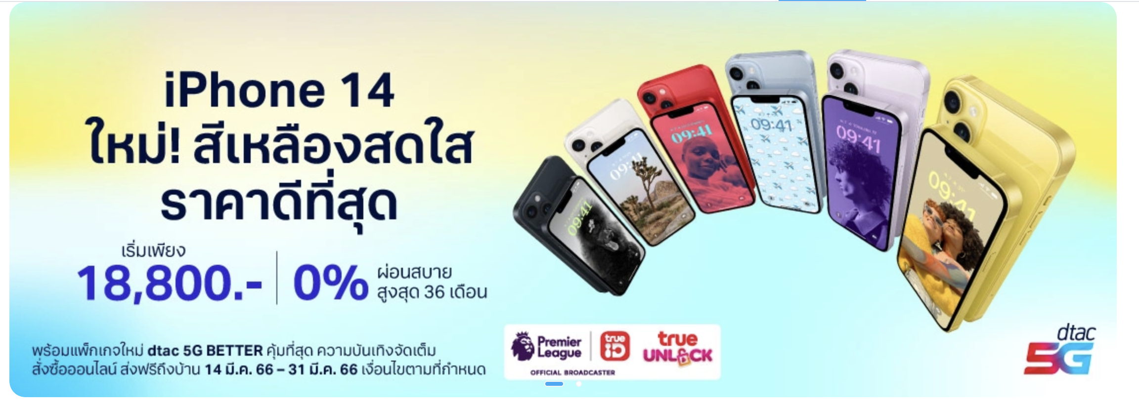 14 มีนาคม 2565 – ดีแทคพร้อมวางจำหน่าย iPhone 14 และ iPhone 14 Plus สีเหลืองใหม่ มอบตัวเลือกสีสันเพิ่มเติมแก่กลุ่มผลิตภัณฑ์iPhone 14 โดย iPhone 14 และ iPhone 14 Plus ออกแบบมาอย่างสวยงามและทนทานยาวนาน มีตัวเครื่องด้านหน้าแบบ Ceramic Shield ดีไซน์ด้านในที่อัปเดตใหม่เพื่อประสิทธิภาพที่ยั่งยืนยิ่งขึ้นและซ่อมแซมได้ง่ายกว่าเดิม มีระยะเวลาการใช้งานแบตเตอรี่ที่น่าทึ่ง ซึ่งiPhone 14 Plus ให้แบตเตอรี่ที่ใช้งานได้นานที่สุดเท่าที่เคยมีมาใน iPhone1 นอกจากนี้ทั้งสองรุ่นยังมาพร้อมระบบกล้องคู่เพื่อรูปถ่ายและวิดีโออันน่าทึ่ง ชิป A15 Bionic ที่ทรงพลัง GPU แบบ 5-core 5G ที่เร็วสุดขีด และความสามารถด้านความปลอดภัยที่เหนือชั้นซึ่งรวมถึงคุณสมบัติการตรวจจับการชนกัน iPhone 14 และ iPhone 14 Plus สีเหลืองใหม่จะเริ่มวางจำหน่ายตั้งแต่วันอังคารที่ 14 มีนาคม