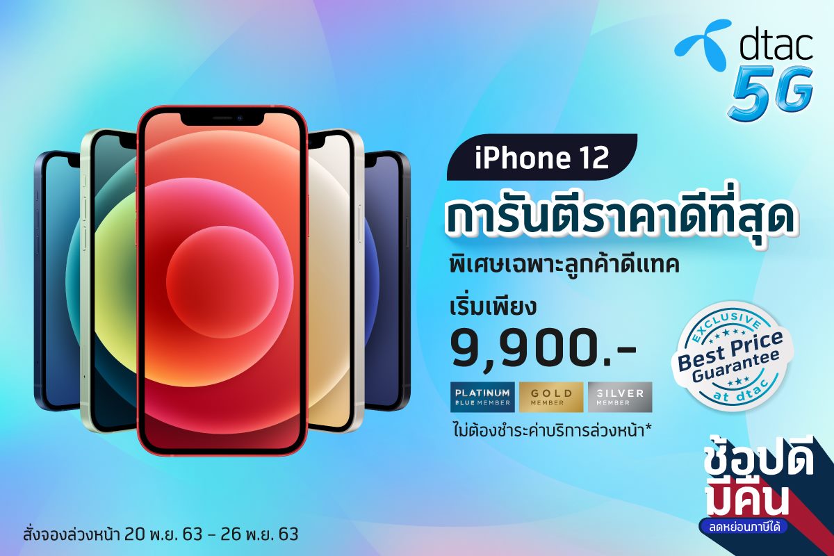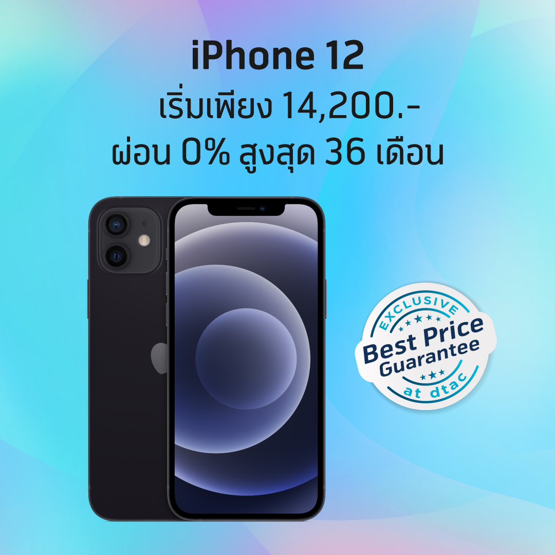 - iPhone 12 เริ่มต้นเพียง 14,200 บาท ไม่ต้องชำระค่าบริการล่วงหน้า สำหรับลูกค้าดีแทคที่มีอายุการใช้งาน 6 เดือนขึ้นไป