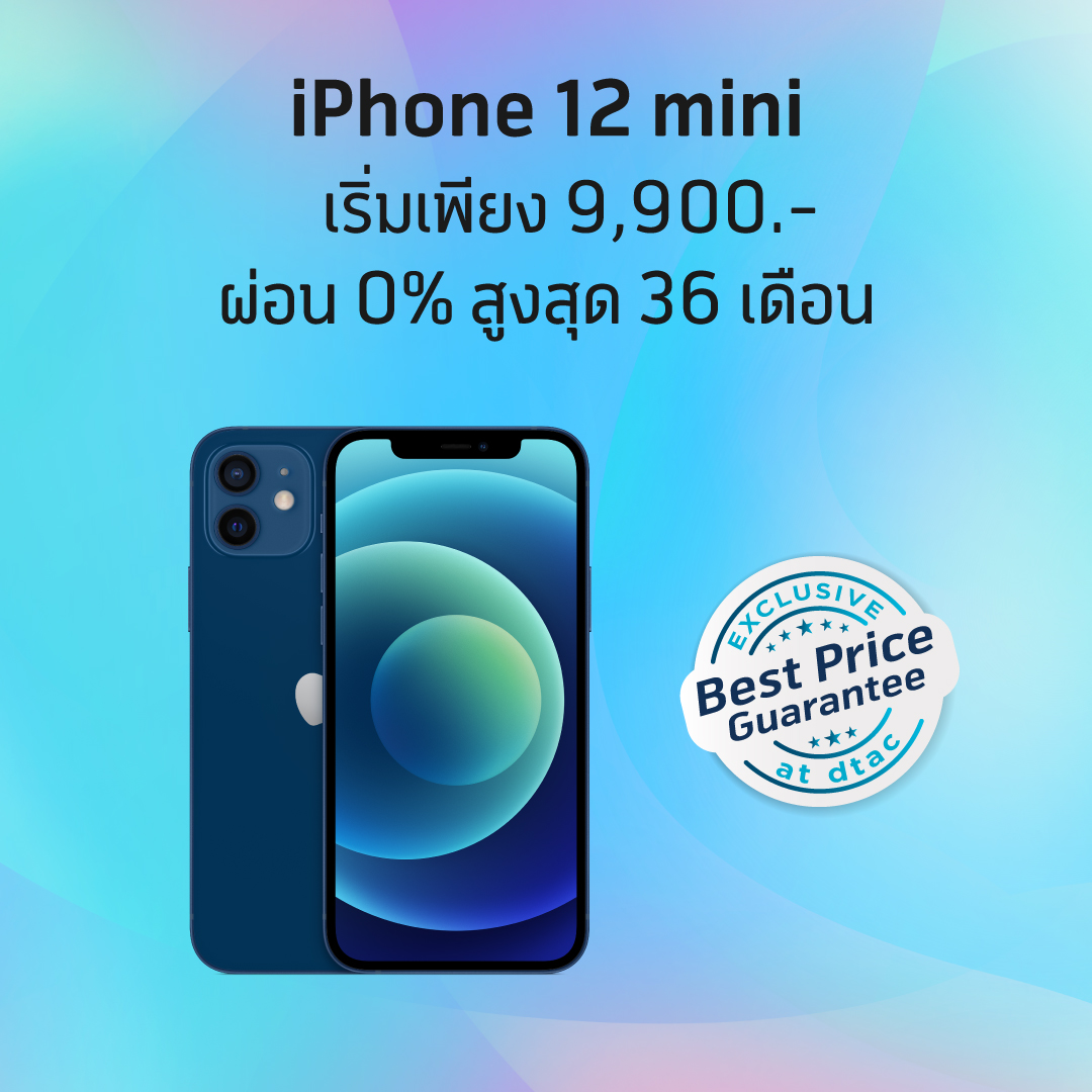 - iPhone 12 Mini เริ่มต้นเพียง 9,900 บาท ไม่ต้องชำระค่าบริการล่วงหน้า สำหรับลูกค้าดีแทคที่มีอายุการใช้งาน 6 เดือนขึ้นไป