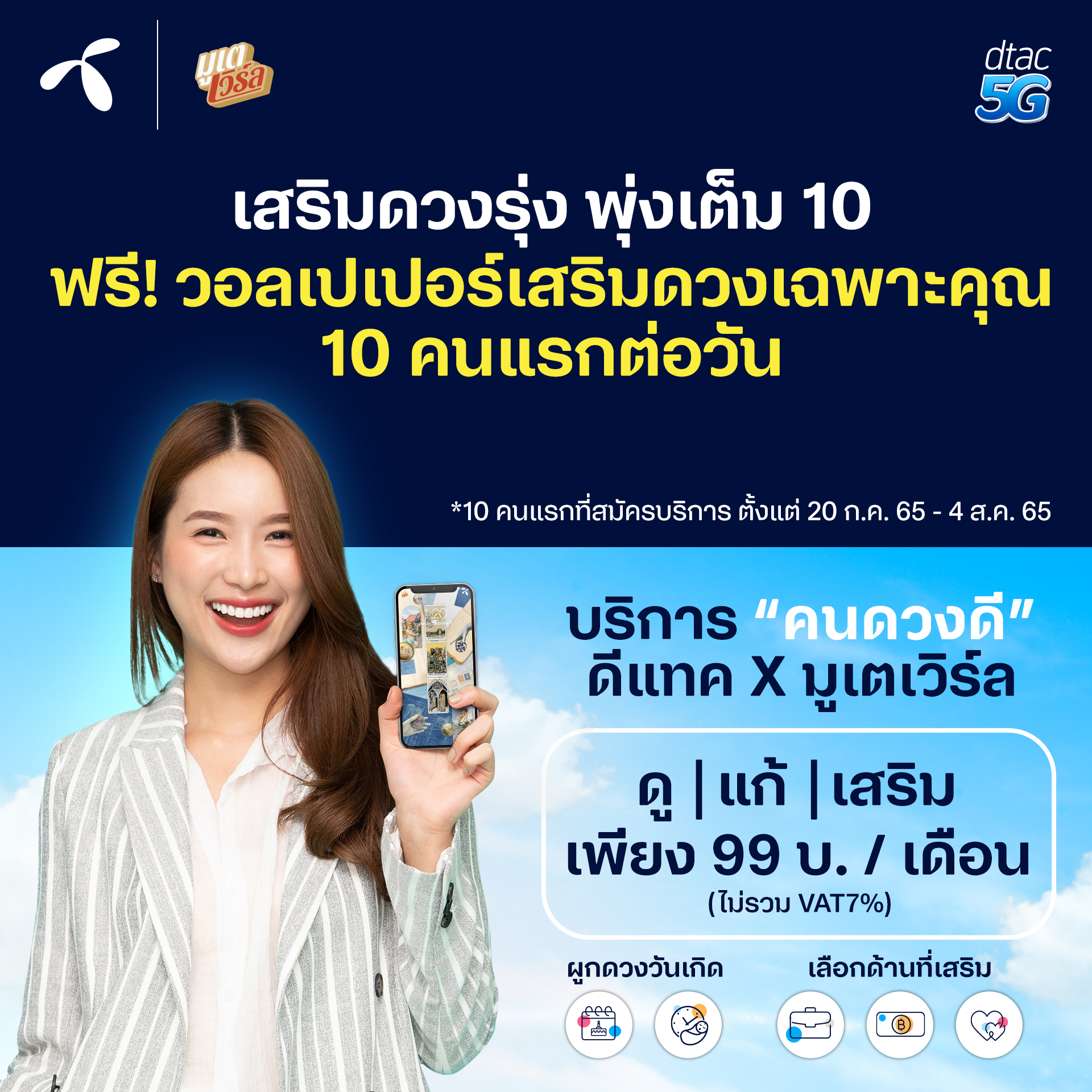 - บริการ ‘คนดวงดี’ ที่มอบวอลเปเปอร์เสริมดวง โดยมูเตเวิร์ลบริการดูดวงแบบครบวงจร สำหรับลูกค้าที่ชื่นชอบดูดวงรายวันพิเศษเฉพาะคุณ แก้ดวงร้ายให้กลายเป็นดี และช่วยเสริมดวงให้ปังด้วยวอลเปเปอร์เสริมดวง เรียกได้ว่าครบครันทั้ง “ดู | แก้ | เสริม” โดยรับบริการได้ทั้งหมด จากแพ็กเกจในราคาเพียง 99 บาท ในช่วงเปิดตัวบริการดีแทคจัดโปรโมชั่น ให้ดวงปังเต็ม 10 พิเศษเฉพาะ 10 คนแรก/วัน เมื่อสมัคร บริการ คนดวงดี รับไปเลยวอลเปเปอร์เสริมดวงเฉพาะคุณจากมูเตเวิร์ล ตั้งแต่ วันนี้ ถึง 4 ส.ค. 65 เท่านั้น สนใจสมัครบริการ ดีแทค คนดวงดี ได้ที่ https://www.dtac.co.th/service/premium/#scPremium