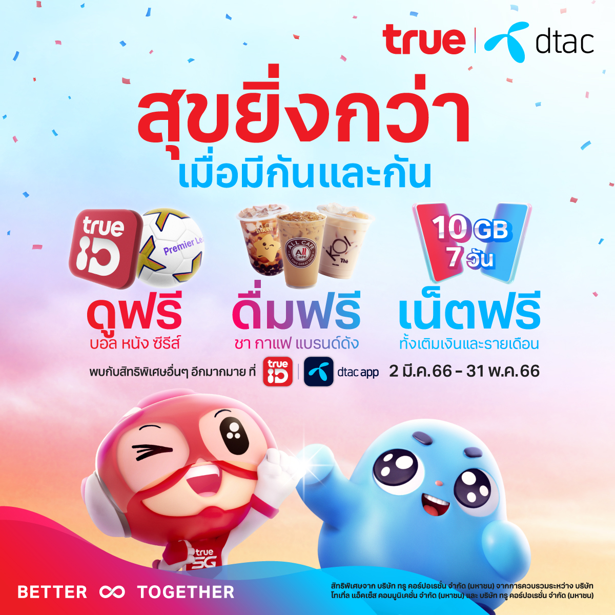 4 มีนาคม 2566 – บมจ. ทรู คอร์ปอเรชั่น มอบของขวัญสุดพิเศษ ให้ลูกค้าดีแทคและทรู ร่วมเฉลิมฉลองในโอกาสแนะนำบริษัทใหม่สู่ตลาด รับสิทธิพิเศษ ‘สุขยิ่งกว่า เมื่อมีกันและกัน’ ทั้งดูฟรี บอล EPL หนัง ซีรีส์ และคอนเทนต์ระดับโลกนาน 30 วัน ดื่มฟรี ชา กาแฟ 1 ล้านแก้ว จากแบรนด์ดัง All Café, KOI The, Dakasi เน็ตฟรี 10GB นาน 7 วัน ทั้งแบบเติมเงินและรายเดือน พร้อมพริวิเลจอีกมายมายที่ดียิ่งกว่า ตรงใจยิ่งขึ้น ที่แอปพลิเคชัน ทรูไอดี และดีแทค แอป ตั้งแต่ 2 มีนาคม 2566 ถึง 31 พฤษภาคม 2566