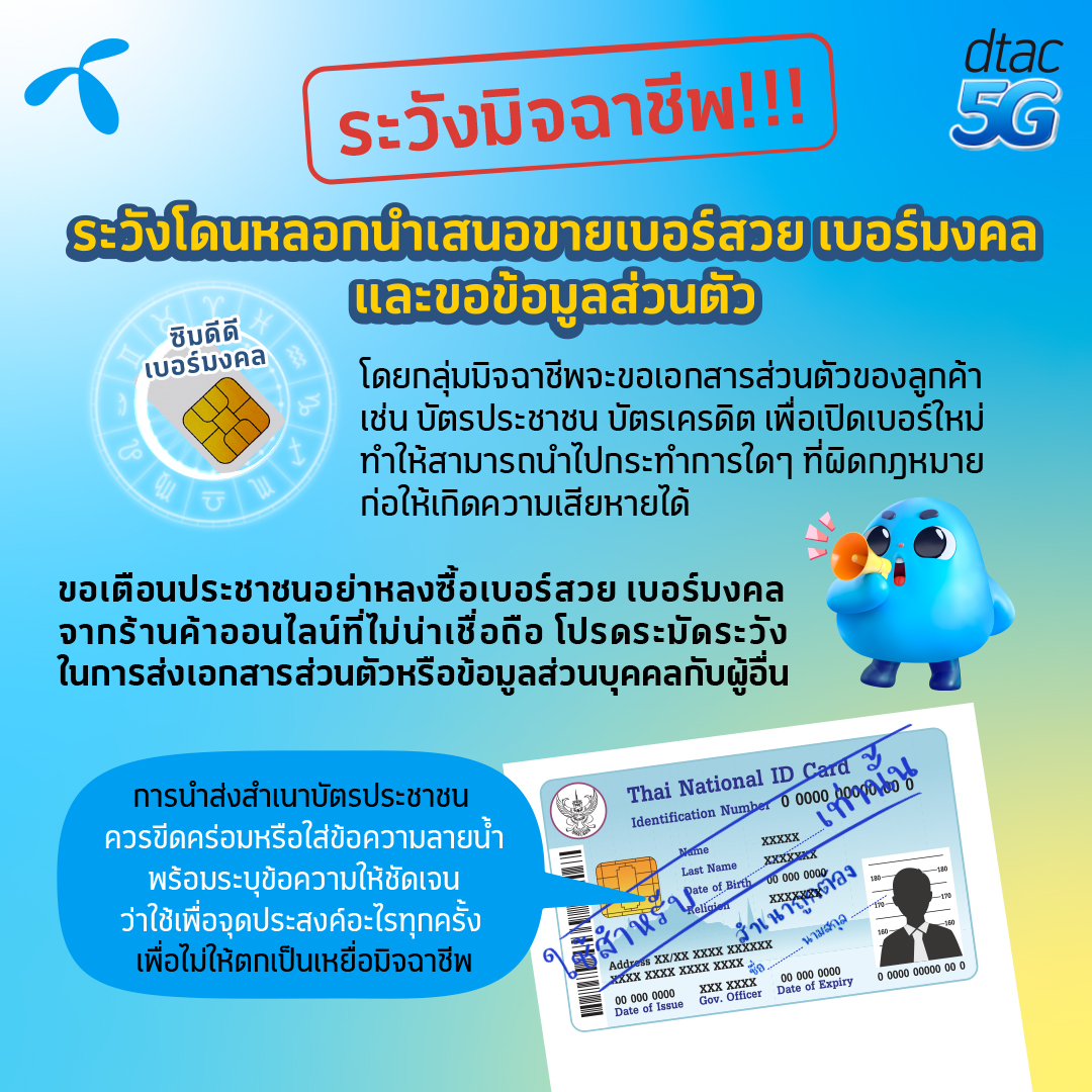 ดีแทคขอแนะนำ การนำส่งสำเนาบัตรประชาชน บัตรเครดิต ให้ทำการขีดคร่อมหรือใส่ข้อความลายน้ำพร้อมระบุข้อความให้ชัดเจนว่าใช้เพื่อจุดประสงค์อะไร เพื่อไม่ให้ตกเป็นเหยื่อมิจฉาชีพ หากลูกค้าไม่แน่ใจ มีความกังวลว่าเบอร์อาจถูกลงทะเบียนซ้ำซ้อนหรือไม่ สามารถสอบถาม ดีแทค คอลเซ็นเตอร์ 1678 ตลอด 24 ชั่วโมง