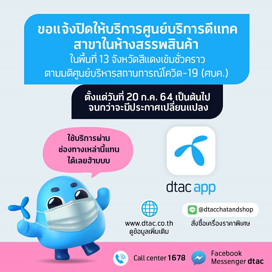 20 กรกฎาคม 2564 – บริษัท โทเทิ่ล แอ็คเซ็ส คอมมูนิเคชั่น จำกัด (มหาชน) หรือดีแทค ขอแจ้งปิดศูนย์บริการชั่วคราวเฉพาะสาขาที่อยู่ในห้างสรรพสินค้า ในเขตพื้นที่เข้มงวดควบคุมสูงสุด 13 จังหวัด ในระหว่างวันที่ 20 กรกฎาคม ถึง 2 สิงหาคม 2564 ยกเว้นศูนย์บริการที่อยู่นอกห้างสรรพสินค้า ยังเปิดให้บริการตามปกติ