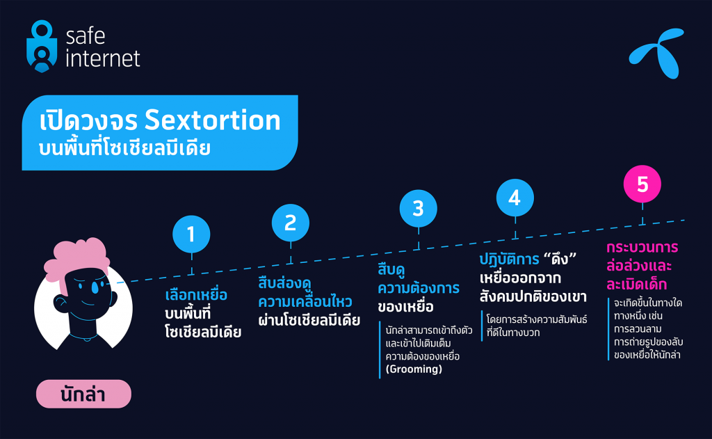 ทั้งนี้ กระบวนการ Sextortion นั้นจะเกิดขึ้นบนพื้นที่ออนไลน์ โดยผู้มีเจตนาในการกระทำผิดหรือ “นักล่า” (Predator) จะเลือก “เหยื่อ” บนพื้นที่โซเชียลมีเดีย เช่น แฟนเพจของน้อง เมื่อเลือกเหยื่อได้แล้ว นักล่าจะเข้าไปสืบส่องดูความเคลื่อนไหวหรือการทำกิจกรรมของเหยื่อที่ทิ้งร่องรอยไว้ผ่านการโพสต์กิจกรรมทางโซเชียลมีเดีย เพื่อสืบดู “ความต้องการ” ของเหยื่อ ทำให้นักล่าสามารถเข้าถึงตัวและเข้าไปเติมเต็มความต้องของเหยื่อได้ ขั้นตอนนี้เรียกว่า “Grooming” หรือการเตรียมเด็กเพื่อวัตถุประสงค์ทางเพศ