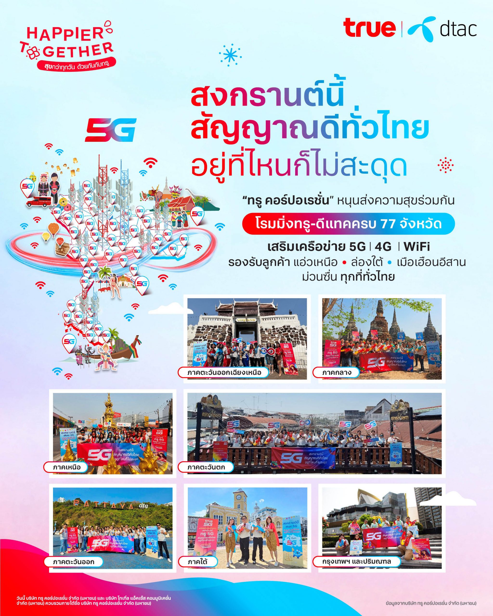 11 เมษายน 2566 – ทรู คอร์ปอเรชั่นเสริมทัพสัญญาณมือถือ 5G 4G และ WiFi สุขยิ่งขึ้นรับสงกรานต์ ส่งสัญญาณดีทั่วไทย ใช้สัญญาณร่วมกัน ครอบคลุมยิ่งขึ้น เร็วแรงยิ่งขึ้น รองรับการใช้งานลูกค้าแบรนด์ทรูและดีแทคทั่วไทยช่วงฉลองเทศกาลสงกรานต์ 2566 และวันหยุดยาวเพื่อเดินทางท่องเที่ยว ไหว้พระทำบุญรับความสุขปีใหม่ไทย พร้อมทั้งลูกหลานที่ทำงานต่างท้องถิ่นจะได้เดินทางกลับภูมิลำเนาพบญาติผู้ใหญ่และอยู่พร้อมหน้าพร้อมตาในครอบครัว รวมถึงสืบสานประเพณีรดน้ำดำหัวผู้ใหญ่เพื่อเป็นสิริมงคล