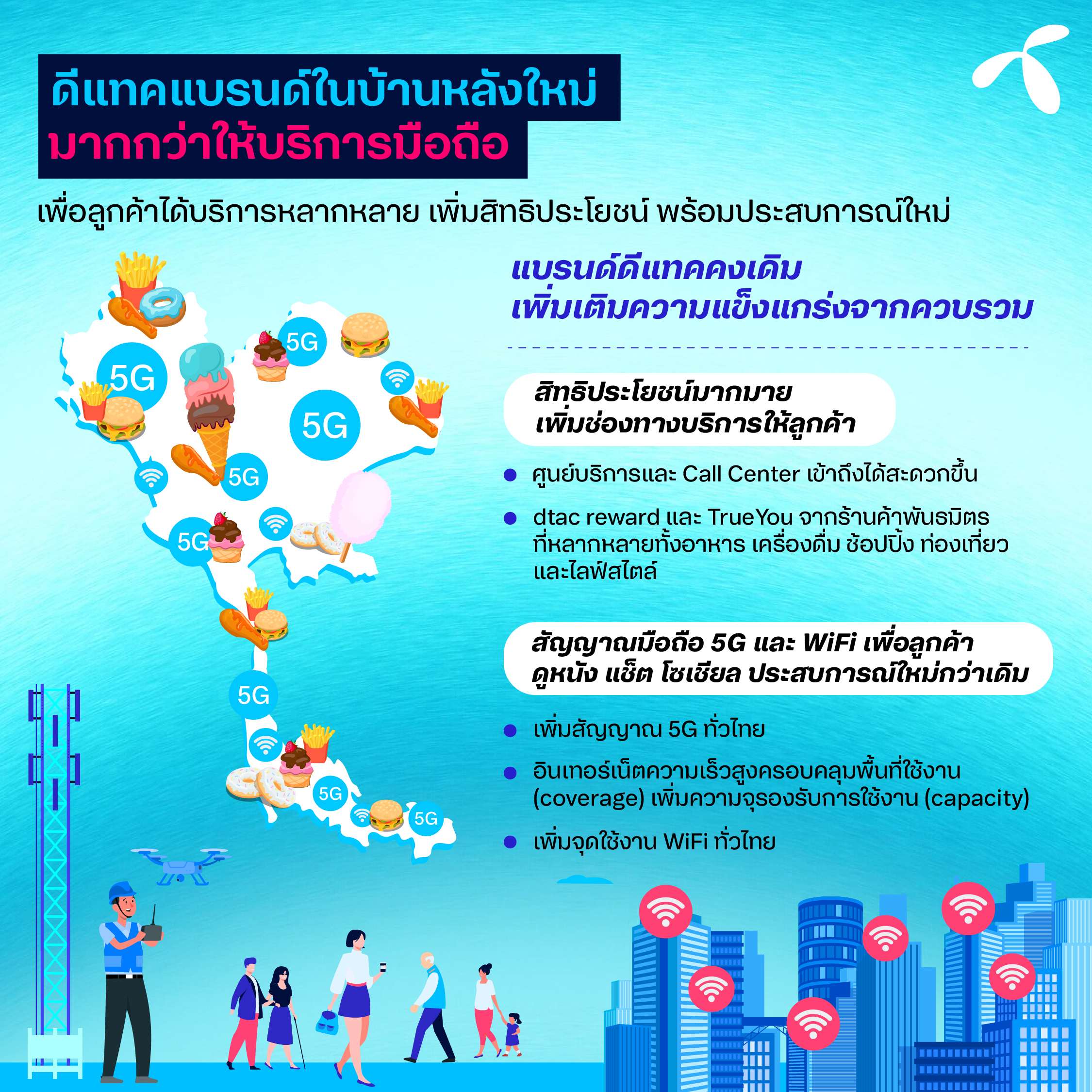 แบรนด์ดีแทคในบ้านใหม่จะเพิ่มสัญญาณ 5G และอินเทอร์เน็ตความเร็วสูงครอบคลุมพื้นที่ใช้งาน (coverage) และเพิ่มความจุรองรับการใช้งาน (capacity) และเพิ่มจุดใช้งาน WiFi สามารถเชื่อมต่อการใช้งานในอาคาร ศูนย์การค้า พื้นที่สาธารณะต่างๆ นอกเหนือจากสัญญาณคุณภาพ 5G และ 4G ถ้าควบรวมสู่บริษัทใหม่เสร็จสิ้น ลูกค้าดีแทคไม่ว่าจะอยู่ในเมือง นอกเมือง พื้นที่ห่างไกล หรือ ไม่ว่าจะเป็นใคร ทั้ง คนทั่วไป นักเรียน นักธุรกิจ พ่อค้า แม่ค้า เกษตรกร จะได้รับประโยชน์ร่วมกัน