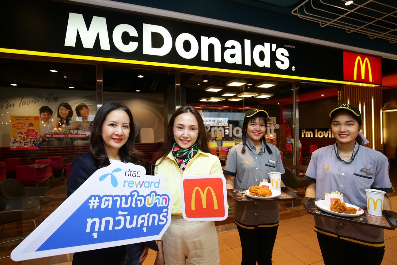 นางสาวเพ็ญพงา สุทธิมณฑล ผู้อำนวยการฝ่ายบริหารลูกค้า ดีแทค รีวอร์ด บริษัท โทเทิ่ล แอ็คเซ็ส คอมมูนิเคชั่น จำกัด (มหาชน) หรือดีแทค (ซ้าย) ร่วมกับนำสุข จันธำรง ผู้จัดการฝ่ายการตลาด บริษัท แมคไทย จำกัด (ที่สามจากขวา) มอบสิทธิพิเศษให้ลูกค้าดีแทค ซื้อ McDonald’s ชุดไก่กรอบเต็มแมค ราคาเพียง 29 บาท จากปกติ 79 บาท เริ่มตั้งแต่วันศุกร์ที่ 6, 13, 20, และ 27 มีนาคม 2563 #ตามใจปากทุกวันศุกร์