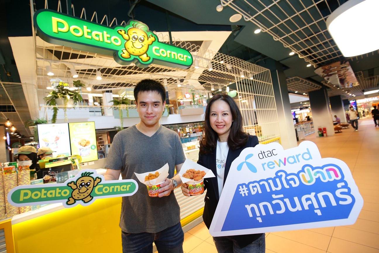 นางสาวเพ็ญพงา สุทธิมณฑล ผู้อำนวยการฝ่ายบริหารลูกค้า ดีแทค รีวอร์ด บริษัท โทเทิ่ล แอ็คเซ็ส คอมมูนิเคชั่น จำกัด (มหาชน) หรือดีแทค (ขวา) ร่วมกับนายชยภัทร ทองเจริญ กรรมการผู้จัดการ บริษัท ร็อคส์ พีซี จำกัด (ซ้าย) มอบสิทธิพิเศษให้ลูกค้าดีแทค ซื้อ Potato Corner ไก่ป๊อบ size Large ราคาเพียง 29 บาท จากปกติ 65 บาท เริ่มตั้งแต่วันศุกร์ที่ 6, 13, 20, และ 27 มีนาคม 2563 #ตามใจปากทุกวันศุกร์