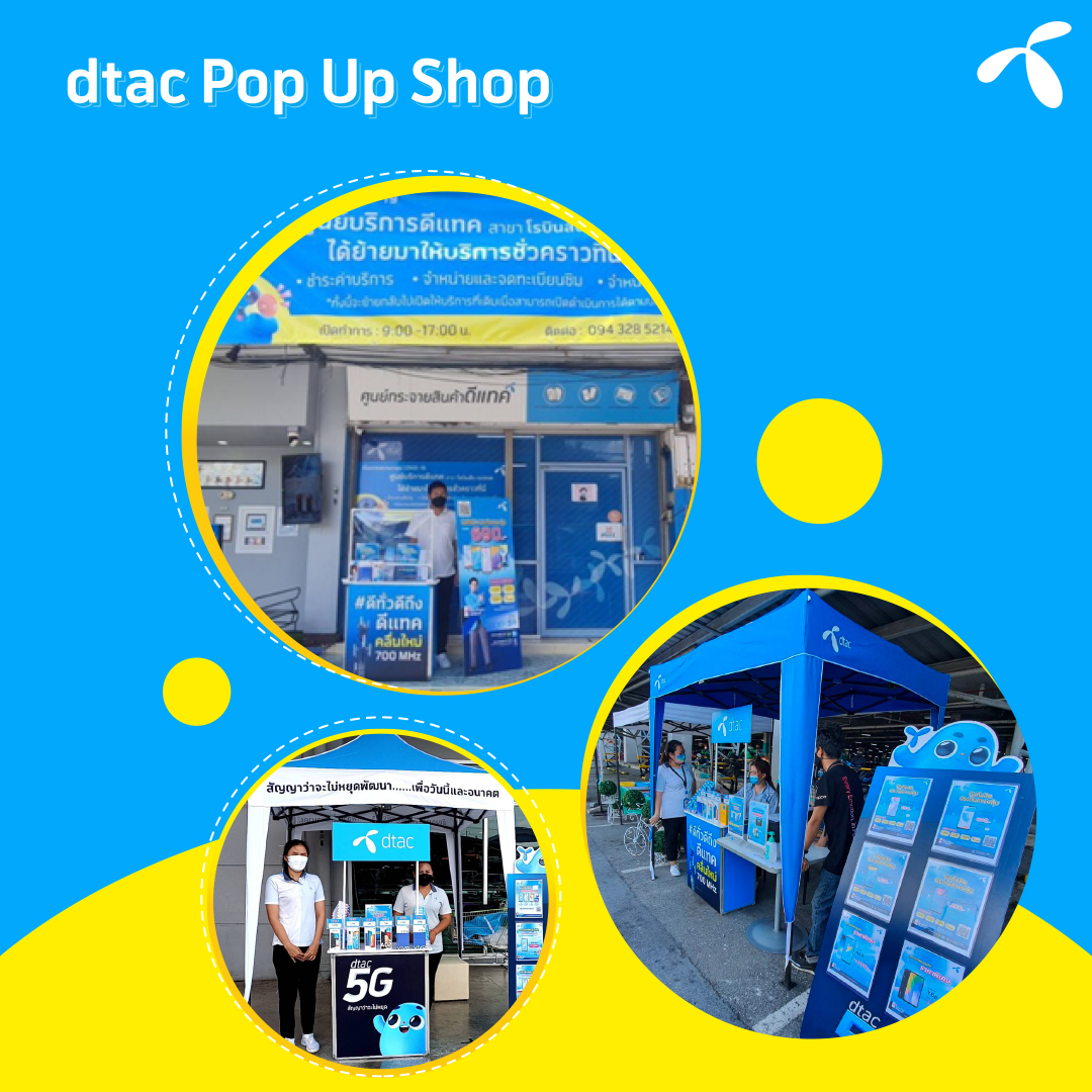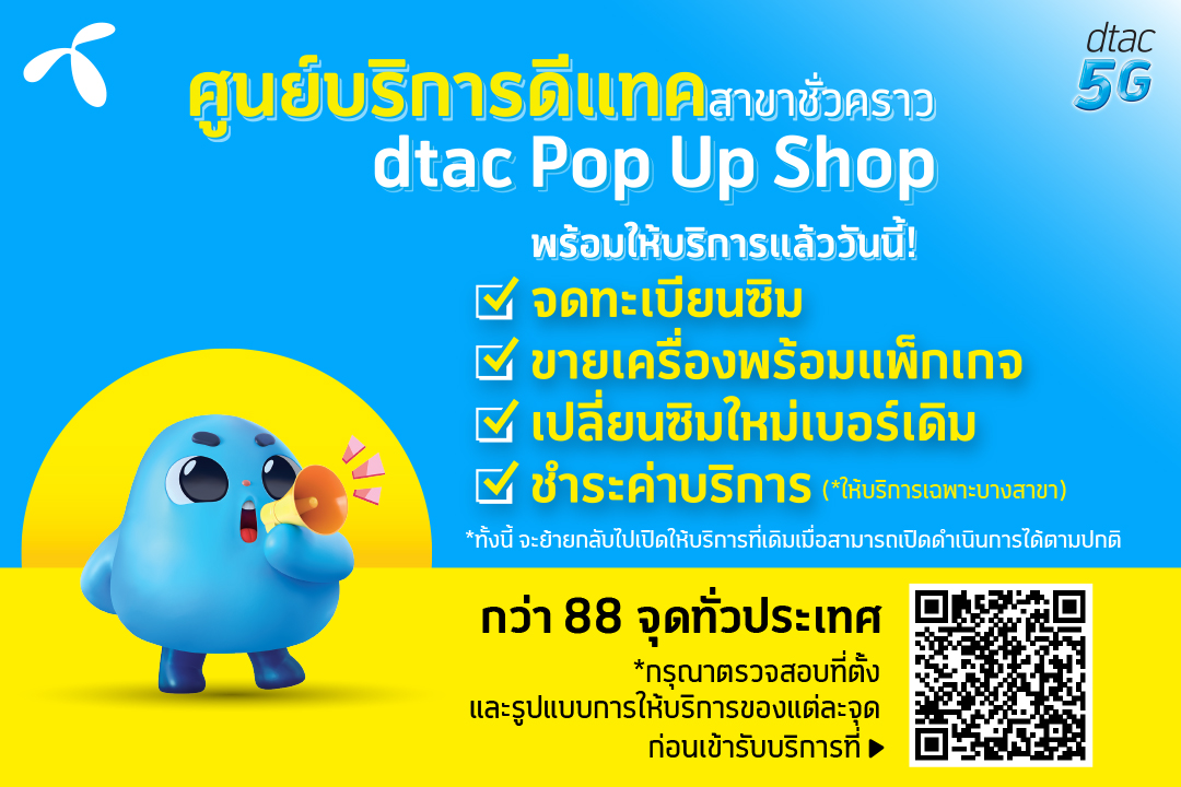 ศูนย์บริการดีแทคชั่วคราวได้เปิดให้บริการแก่ลูกค้าในบริเวณใกล้เคียงกับศูนย์บริการที่ปิดให้บริการในห้างสรรพสินค้า รวมถึงในพื้นที่ใกล้แหล่งชุมชน ทั้งในเขตพื้นที่กรุงเทพฯ ปริมณฑล และต่างจังหวัด จำนวนกว่า 80 แห่ง (88 สาขา ณ 23 ส.ค.64) ซึ่งจะเปิดให้บริการทุกวันตั้งแต่เวลา 10.00 – 18.00 น. ทั้งนี้ ลูกค้าสามารถสอบถามสถานที่ตั้งศูนย์บริการดีแทคชั่วคราว ได้ที่ ดีแทค Call Center 1678