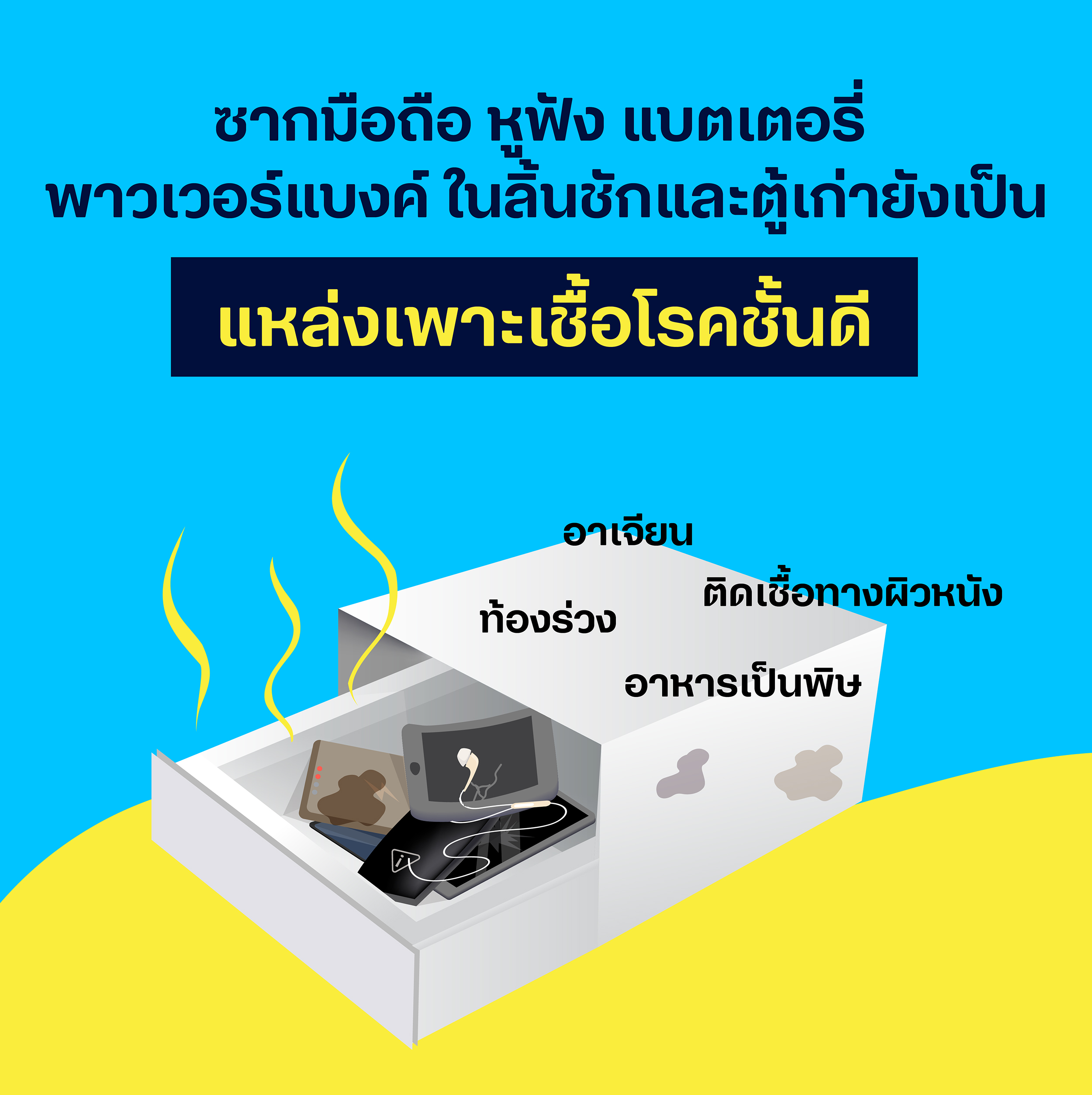 ซากมือถือ แบตเตอรี่ พาวเวอร์แบงค์เก่า ที่ถูกเก็บไว้ในลิ้นชักหรือตู้เก็บของเก่าเป็นระยะเวลานาน เป็นแหล่งเจริญพันธุ์ของเชื้อโรคชั้นดี แม้เชื้อโรคเหล่านี้จะไม่ได้ส่งผลให้เราเกิดอาการป่วยทันที แต่ก็เป็นบ่อเกิดของโรคหัวใจ ระบบประสาท ส่งผลต่อระบบทางเดินอาหาร และสุขภาพในระยะยาวได้โดยที่เราไม่รู้ตัว