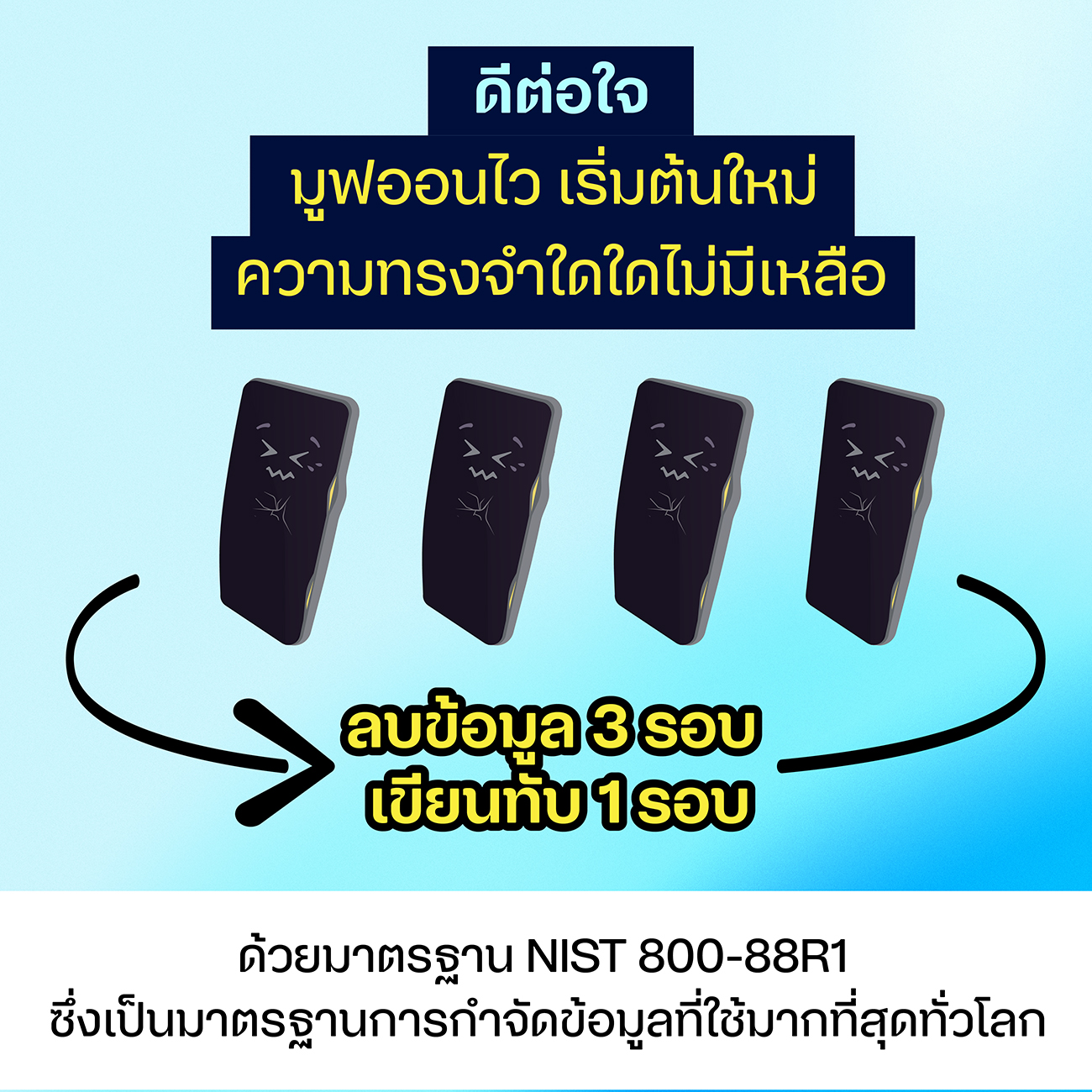 หลังจากที่ ‘ดีแทค ทิ้งให้ดี’ รับซากมือถือเก่าที่ศูนย์บริการดีแทคเรียบร้อยแล้ว จะทำการส่งซากมือถือต่อให้บริษัทรีไซเคิลที่ได้มาตรฐานสากล ทำลายหน่วยความจำในตัวเครื่อง ด้วยการใช้โปรแกรมซอฟต์แวร์ในการลบข้อมูลถึง 3 รอบ และเขียนข้อมูลทับอีก 1 รอบ ด้วยมาตรฐาน NIST 800-88R1 ซึ่งเป็นมาตรฐานการกำจัดข้อมูลที่ใช้มากที่สุดทั่วโลก เพื่อให้มั่นใจได้ว่า จะไม่มีข้อมูลใด ๆ รั่วไหล ลบความทรงจำในตัวเครื่อง มูฟออนไวรับปีใหม่แน่นอน