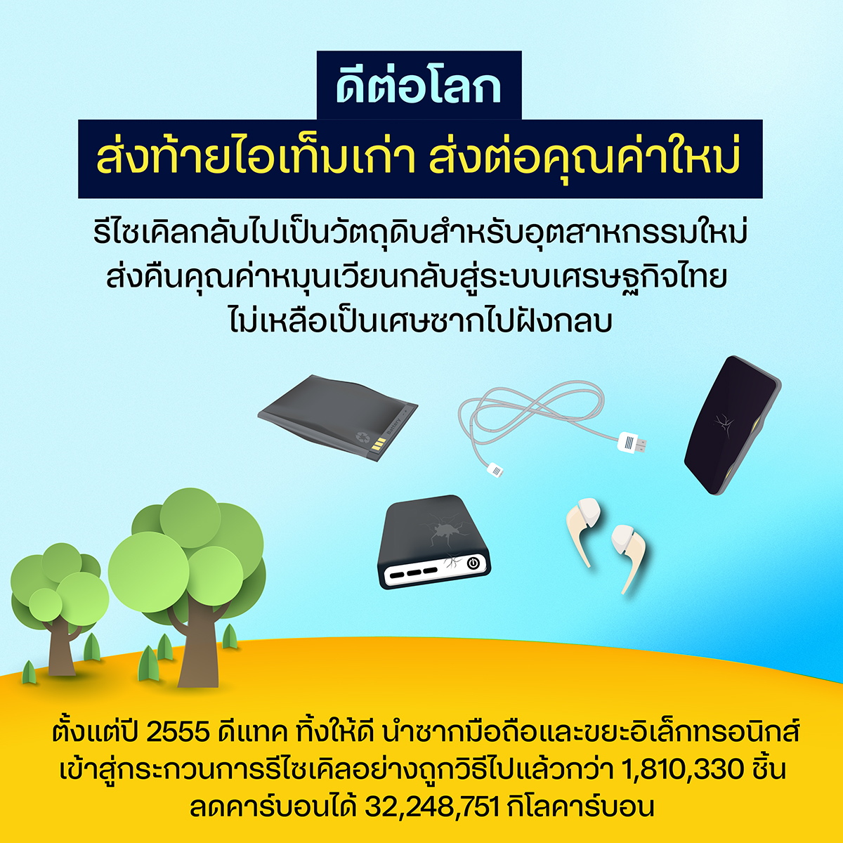 ดีแทคนำซากมือถือและอุปกรณ์เก่า เข้าสู่กระบวนการรีไซเคิลอย่างถูกวิธีไปแล้วกว่า 1,810,330 ชิ้น ลดคาร์บอนได้มากกว่า 32,248,751 กิโลคาร์บอน ตั้งแต่ปีพ.ศ.2555 รีไซเคิลกลับไปเป็นวัตถุดิบสำหรับอุตสาหกรรมใหม่ ส่งคืนคุณค่าหมุนเวียนกลับสู่ระบบเศรษฐกิจไทย ไม่เหลือเป็นเศษซากไปฝังกลบ ตามเป้าหมายการจัดการผลกระทบด้านสิ่งแวดล้อมและสภาวะอากาศ ซึ่งเป็นหนึ่งในกลยุทธ์การดำเนินธุรกิจอย่างมีความรับผิดชอบที่ดีแทค เพื่อมุ่งสู่เป้าหมายการลดก๊าซเรือนกระจกลงให้ได้ “ครึ่งหนึ่ง” ในปี 2573