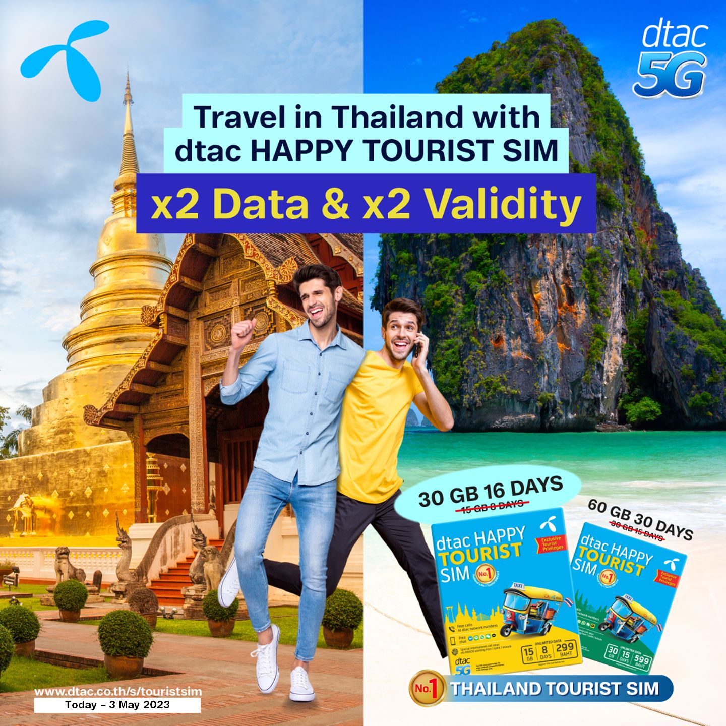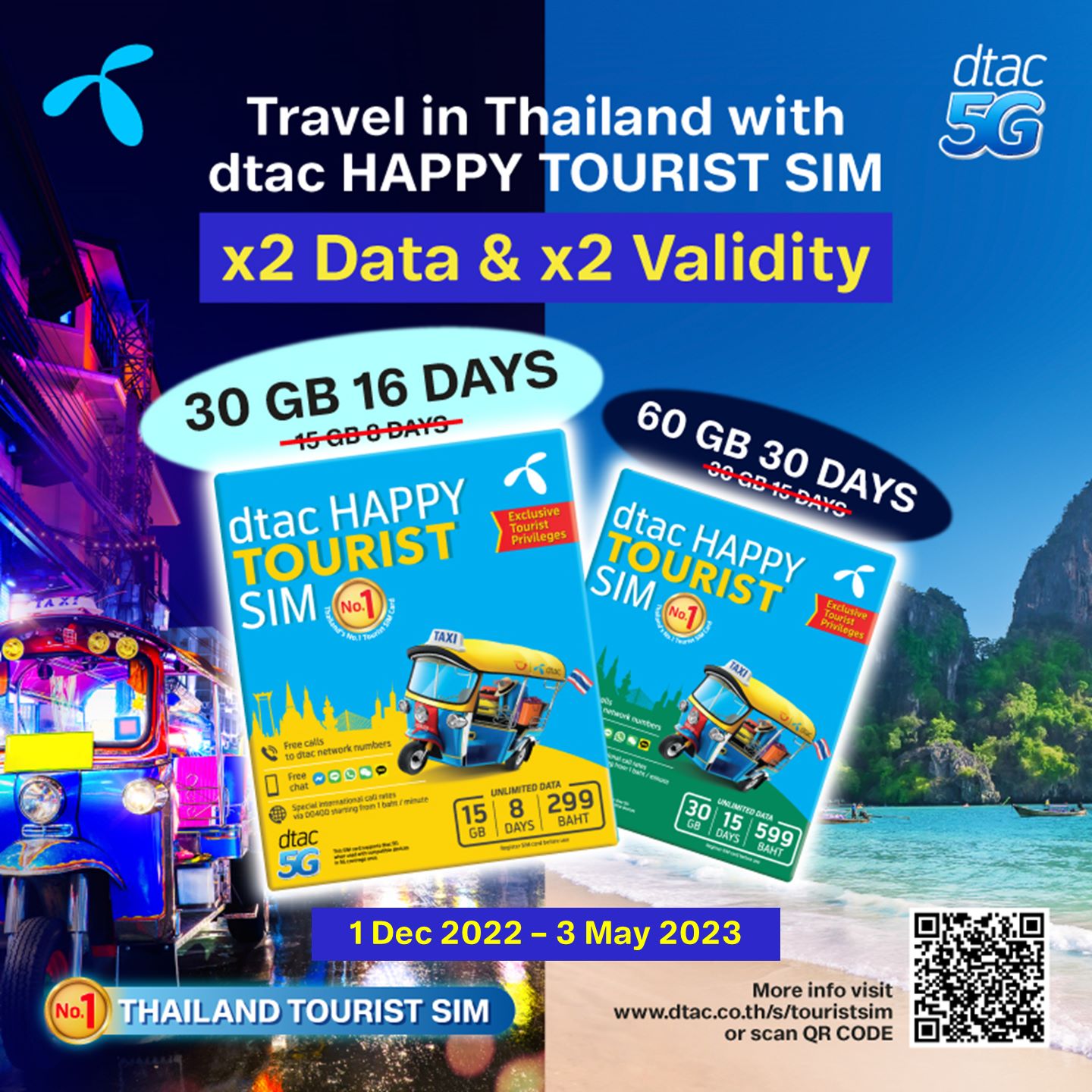 - ซิมดีแทค แฮปปี้ ทัวริสต์ 599 บาท สำหรับใช้งาน 15 วัน เติมวันใช้งานได้เพิ่ม 2 เท่า เป็น 30 วันและเพิ่มอินเทอร์เน็ตจาก 30 GB เป็น 60 GB