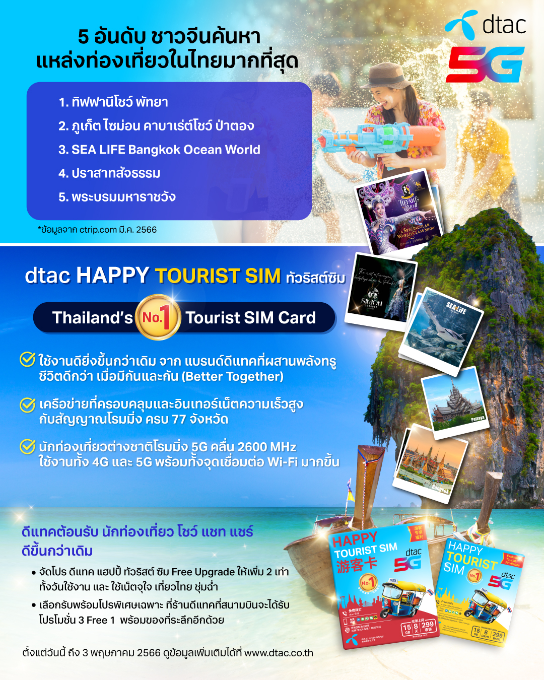 12 เมษายน 2566 – ดีแทคเตรียมพร้อมต้อนรับนักท่องเที่ยวจีน ที่วางแผนเดินทางมาท่องเที่ยวในช่วงเทศกาลสงกรานต์และช่วงวันแรงงานจีน ซึ่งเป็นวันหยุดยาวในปีนี้ ข้อมูลการท่องเที่ยวแห่งประเทศไทย คาดว่าในเดือนเมษายนนี้ จะมีนักท่องเที่ยวจีนเดินทางเข้ามา 2.5 ถึง 3 แสนคน ส่วนนักท่องเที่ยวโดยรวมน่าจะอยู่ที่ประมาณ 1-2 ล้านคน ดีแทค แฮปปี้ ทัวริสต์ซิม ซึ่งเป็น No.1 ทัวริสต์ซิม ที่มีส่วนแบ่งทางการตลาดในกลุ่มนักท่องเที่ยวจีนอันดับ 1 จัดโปรโมชั่นสุดพิเศษโดนใจนักท่องเที่ยวเดินทางทั่วไทย เหนือจรดใต้ ได้ประสบการณ์ดีขึ้น ทั้งโพสต์รูป อัพคลิปวีดีโอ โซเชียลมีเดีย ฟังเพลง ผ่านแอปพลิเคชันต่างๆ กับโปรสุดคุ้ม Free Upgrade ซิมดีแทค แฮปปี้ ทัวริสต์ให้เบิ้ล 2 ทั้ง วันใช้งาน และ อินเทอร์เน็ต จากแบรนด์ดีแทคที่ผสานพลังทรู ชีวิตดีกว่า เมื่อมีกันและกัน (Better Together) ทำให้ดีแทค แฮปปี้ ทัวริสต์ซิม ใช้งานดียิ่งขึ้นกว่าเดิม ด้วยเครือข่ายที่ครอบคลุมและอินเทอร์เน็ตความเร็วสูง กับสัญญาณโรมมิ่ง ครบ 77 จังหวัด นักท่องเที่ยวต่างชาติสามารถโรมมิ่ง 5G คลื่น 2600 MHz ใช้งานทั้ง 4G และ 5G พร้อมทั้งจุดเชื่อมต่อ Wi-Fi มากขึ้น ซื้อซิมดีแทคได้เลยที่ https://www.dtac.co.th/en/prepaid/products/tourist-sim.html และนักท่องเที่ยวที่ลงเครื่องแล้ว สามารถแวะเปิดซิมใช้บริการได้ที่ เคาน์เตอร์ดีแทค สนามบินสุวรรณภูมิ ดอนเมือง และภูเก็ต ได้ตั้งแต่วันนี้