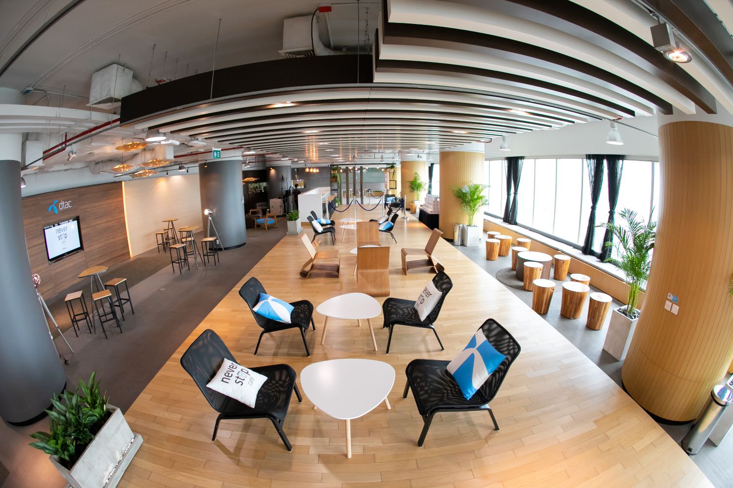 หรือแม้กระทั่งดีแทคเองก็จัดพื้นที่ในองค์กรสู่ความไฮเทค ด้วยการเปิดร้านกาแฟ Never Stop Cafè ที่ดีแทค เฮาส์ ชั้น 32 อาคารจามจุรีสแควร์ จากจุดเริ่มต้นด้วยแนวคิด EIC (Engagement, Innovation, Collaboration) ที่ต้องการพื้นที่ให้พนักงานมีส่วนร่วม มีการพูดคุย แลกเปลี่ยนความคิดเห็น ทั้งเรื่องงานและเรื่องทั่วไป เพื่อต่อยอดความคิดไปสู่นวัตกรรมใหม่ๆ ในองค์กร และมีพื้นที่ทำงานร่วมกันที่ไม่ใช่แค่ร้านกาแฟเท่านั้น ดีแทคได้เสริมเทคโนโลยี 5G เข้าไปในพื้นที่ร้านกาแฟ ด้วยการนำคลื่นความถี่ 28GHz มาให้ใช้งานผ่านเสาสัญญาณ 5G ของจริงในบริเวณชั้น 32 เพื่อให้พนักงานได้เริ่มต้นเรียนรู้เกี่ยวกับ 5G และยังได้ใช้งาน 5G WiFi Hotspot ในพื้นที่ร้านกาแฟ Never Stop Cafè ซึ่งจะเพิ่มทั้งประสิทธิภาพการทำงานเข้าสู่โลกออนไลน์ด้วยความเร็วสูงกว่าอินเทอร์เน็ตธรรมดา และยังเป็นการเรียนรู้สู่เทคโนโลยีการสื่อสาร 5G ร่วมกัน แน่นอนว่าในอนาคตเมื่อ 5G มาถึง การพัฒนาสู่บริการอินเทอร์เน็ตไร้สายแบบประจำที่ หรือ Fixed Wireless Access (FWA) จะเป็นอีกหนึ่งบริการที่สำคัญของ 5G อีกด้วย